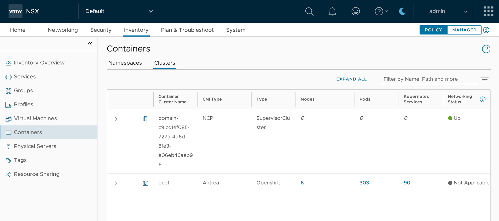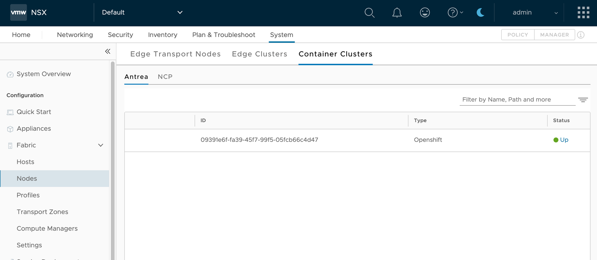 After a few seconds, the Antrea cluster should be registered with NSX. In the NSX Manager UI, under System->Fabric->Nodes->Container->Clusters->Antrea, you should see the cluster and the status should be green.